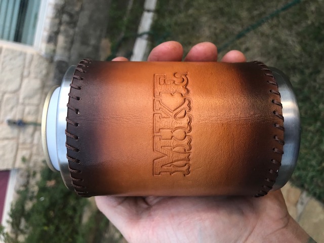 Insulated stainless steel beer coozie wrapped in hand airbrushed and hand stitched genuine leather. Can fit up to 3 initials. Coozie and wrap included. Beer not included.