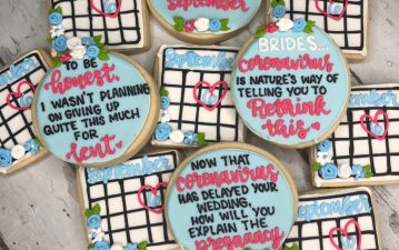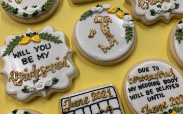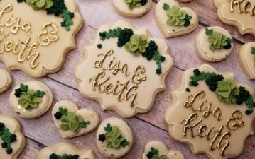Set includes 12 large cookies, 3 hearts, 3 rings, 3 dresses, and 3 round cookies with initial. Please include in the note to seller section the monogram, and the full names of the bride and groom, and their new last name! Colors are shades of dusty rose, brown, white, tan, and gold. Our sugar cookies are soft baked, hand decorated with a sweet vanilla bean glaze, and heat sealed to lock in the fresh baked taste.